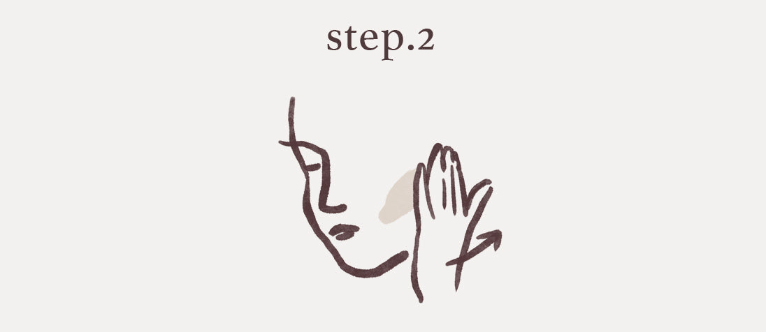 首も同様に伸ばし、目のキワなど気になる箇所には指の腹を使ってなじませてください。最後に、顔と首全体を手のひらで丁寧に包み込むように、浸透させます。